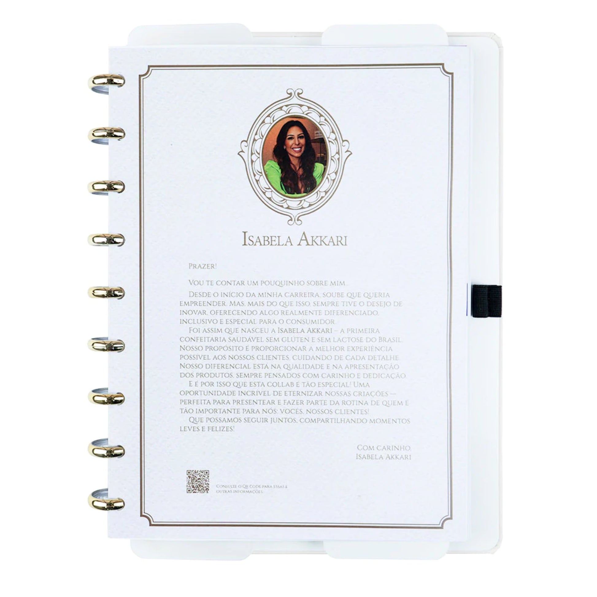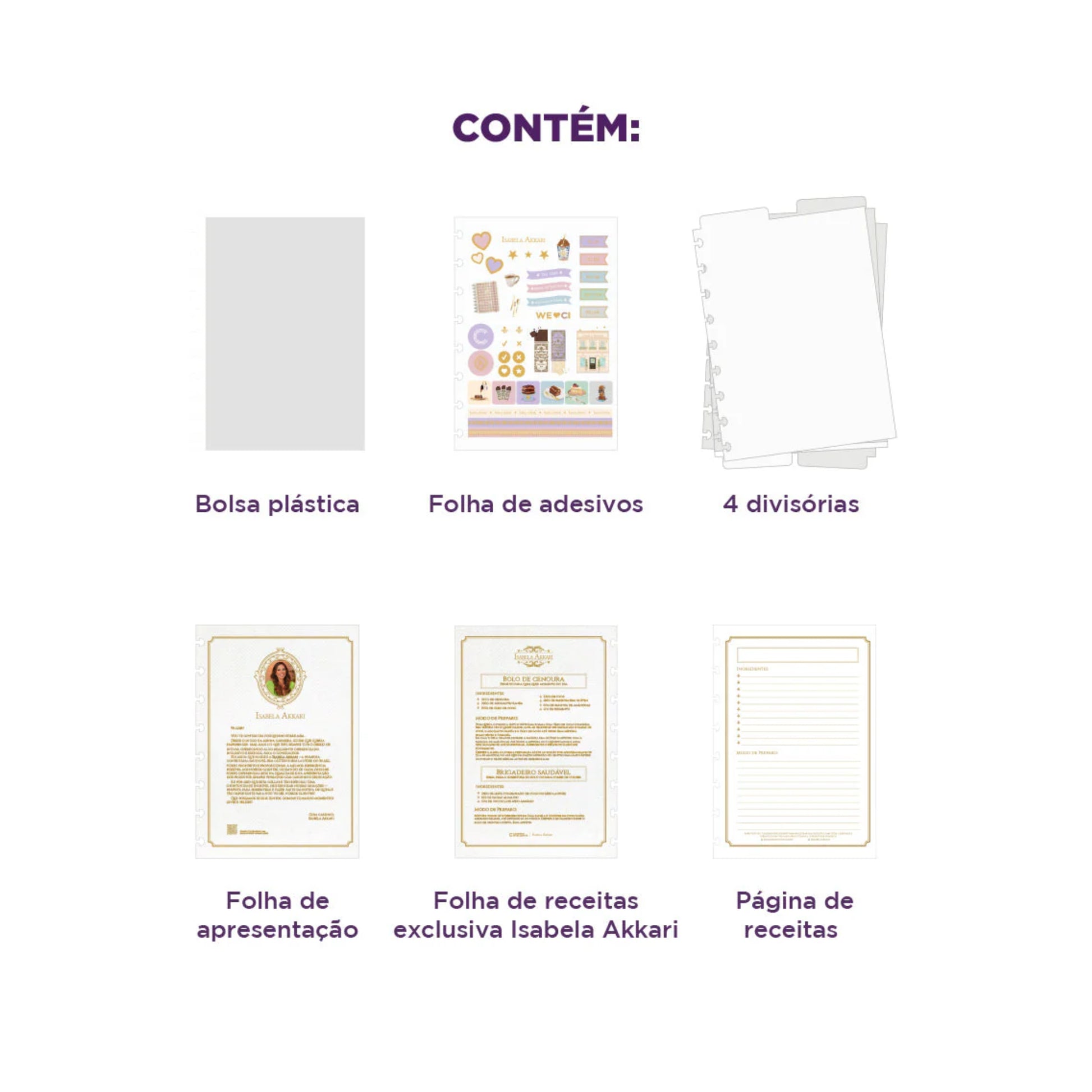 Extras: Capa e contracapa rígidas, 01 folha de adesivos exclusivos, 01 bolsa plástica, 01 folha de instrução de uso e manuseio, com refis e acessórios da marca disponíveis no verso, 01 folha de identificação com calendário no verso, 01 folha de apresentação Isabela Akkari, 01 folha de receita Isabela Akkari, 01 folha para anotação de receita, 04 divisórias com clean (02 transparentes e 02 branco gelo) abas para identificação localizadas nas partes superior e inferior, 80 folhas offset 90g (60 folhas pautadas e 20 folhas lisas brancas para impressão), 01 suporte com elástico para 01 caneta ou 01 lápis e discos M + elástico.