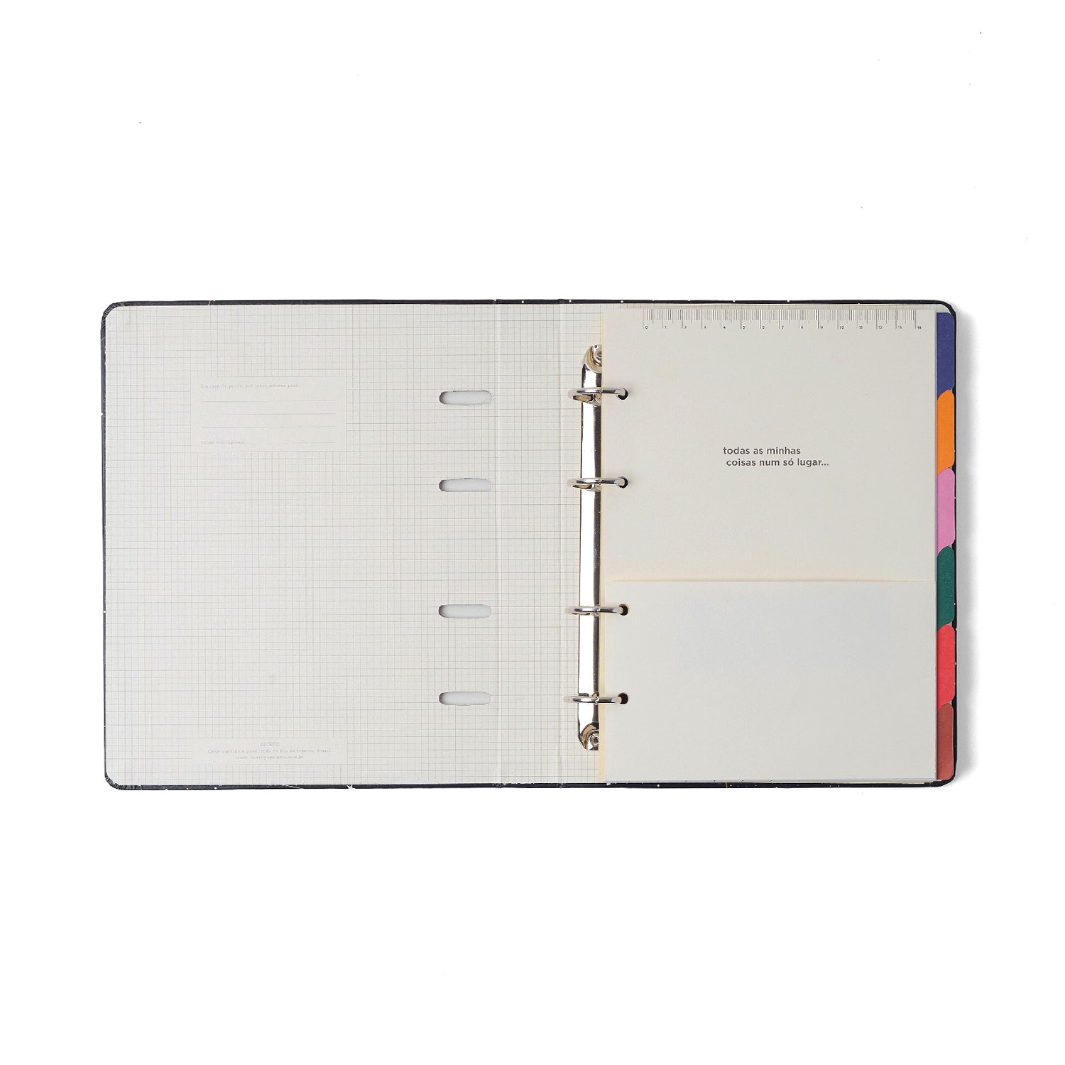 Com argolas resistentes e ferragem prata de 4 furos, ele permite que você configure o seu jeito de usar — trocando refis, organizando divisórias, adaptando pro que mais importa pra você. O miolo pautado (17x24) convida a rabiscar pensamentos, anotar planos, listar sonhos. E o melhor: o papel Pólen® Natural 80 g/m² traz escrita suave, suporta caneta sem muita transparência e entrega aquele toque sofisticado que a gente ama.