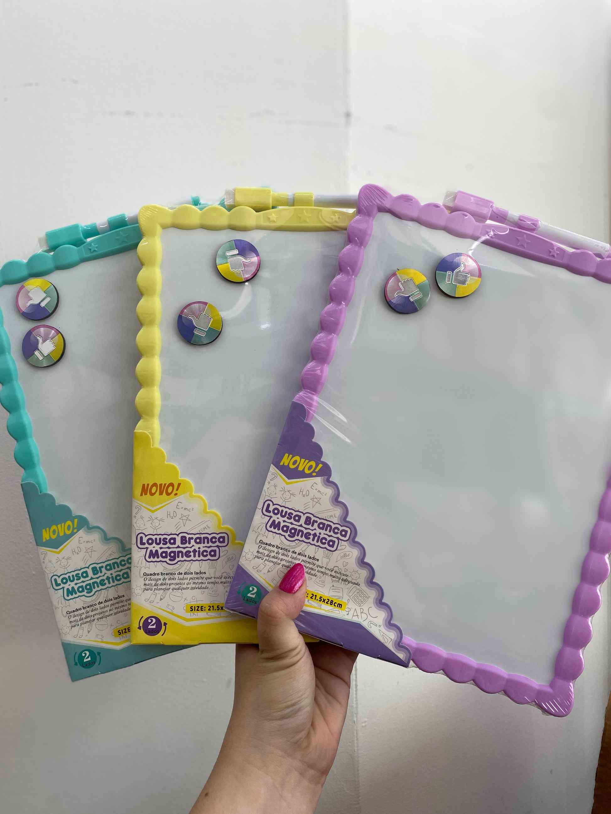 Outros: Superfície magnética; acompanha caneta com apagador e ímãs de fixação.