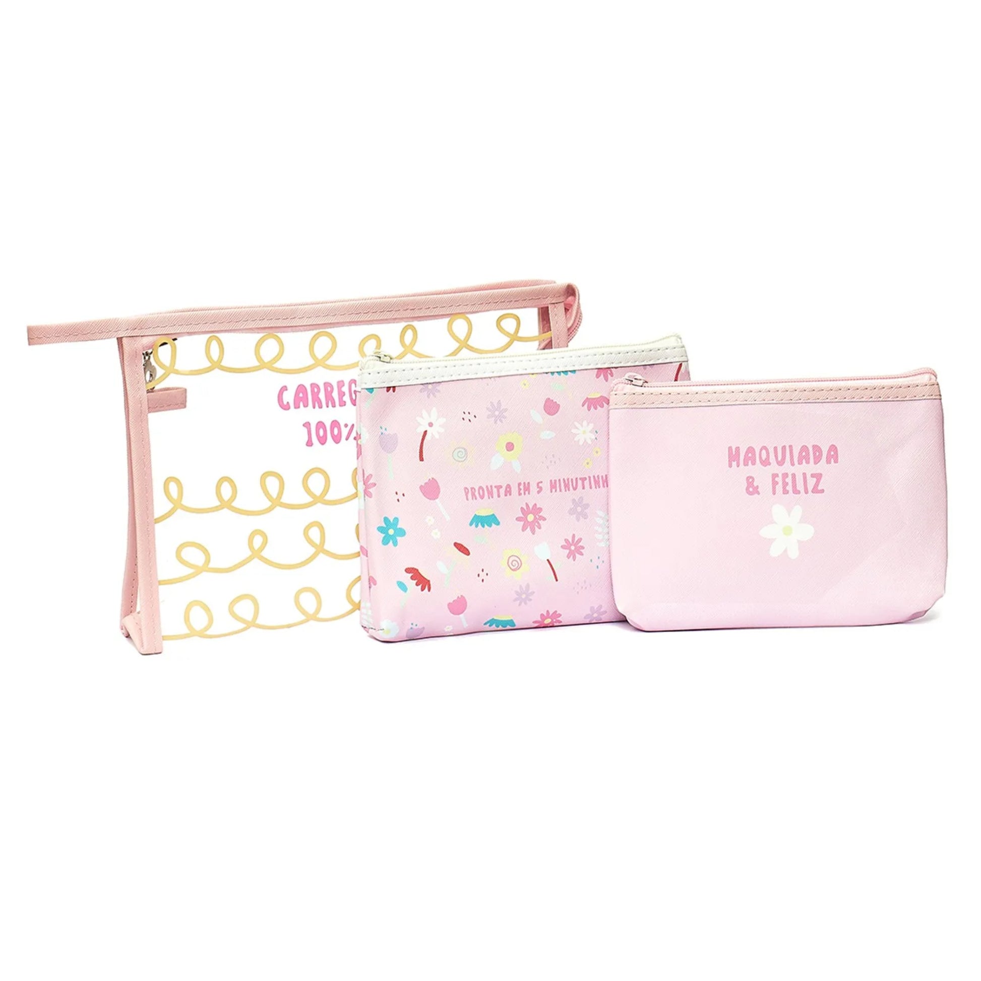 O Conjunto de Necessaire Floriê com 3 Peças é ideal para quem busca organização total com muito estilo. A estampa divertida com a frase "Carregando... 100% linda!" é pura inspiração e alto astral. Perfeito para guardar maquiagem, itens de higiene e acessórios, este kit oferece versatilidade máxima para o seu dia a dia, sua bolsa ou sua mala de viagem.